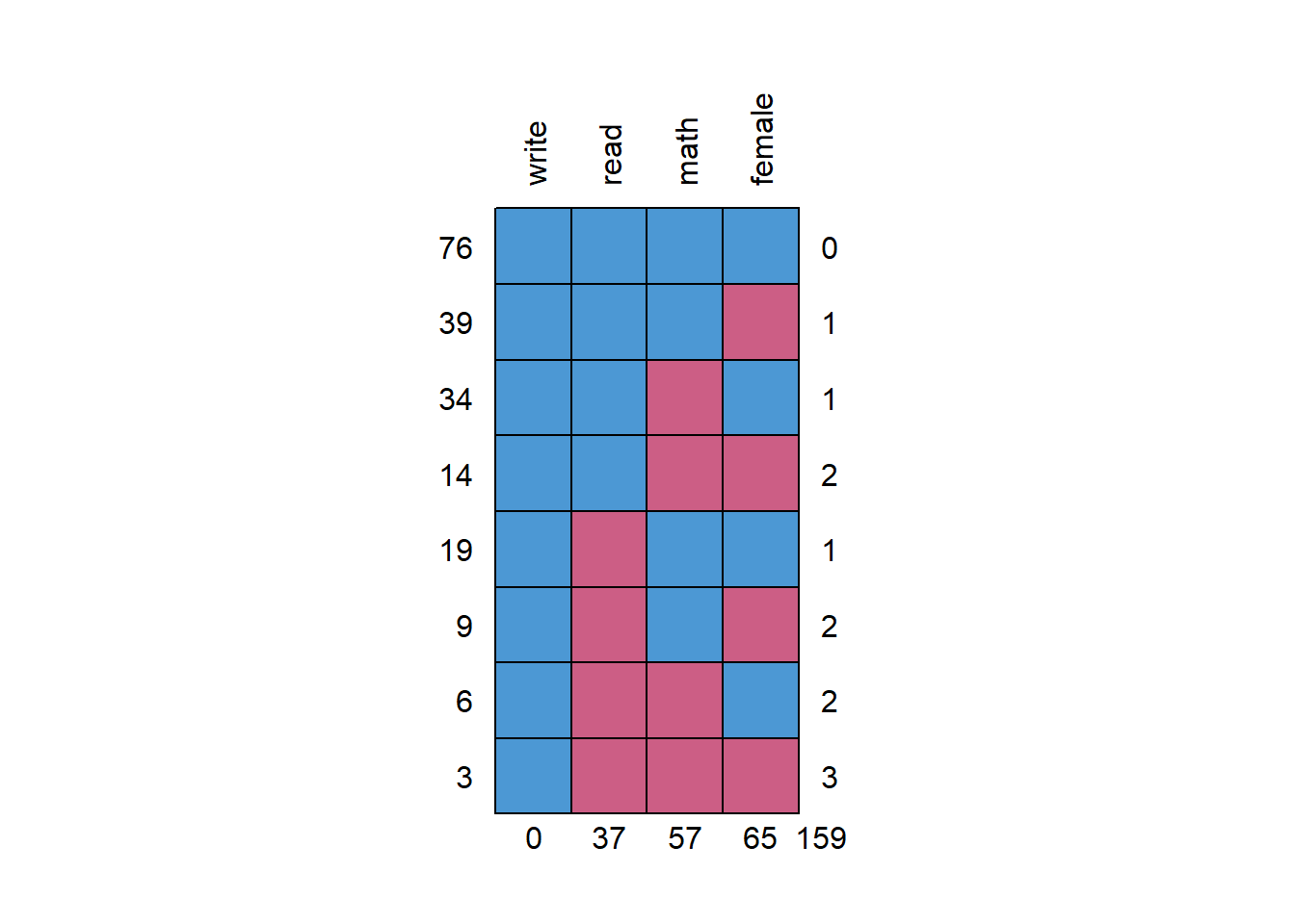 names(hsbwmiss2) <- c('female', 'read', 'write', 'math')We can just look at the patterns of missing data quickly too using the mice package.