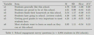 x <- mcfa.input("sid", raw) #sid is the school id or clustering variable